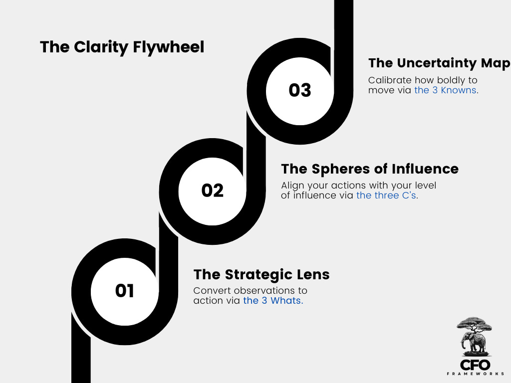 The real power of these frameworks emerges when they work together. Like a flywheel in engineering, the system gains momentum with each turn: facts revealed through your Uncertainty Map strengthen your Strategic Lens, influence gained through focused action expands your Sphere, and clarity about what you can control helps you navigate uncertainty more confidently.