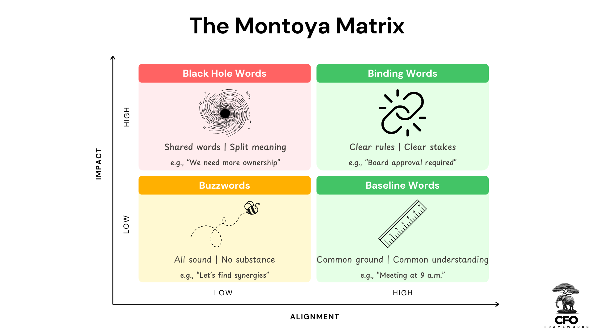 Understanding these quadrants reveals why some organizations thrive while others stumble over their words. In healthy environments, teams actively convert Black Hole Words into Binding Words. In toxic ones, people learn to hide behind comfortable vagaries—using ambiguity as a shield.